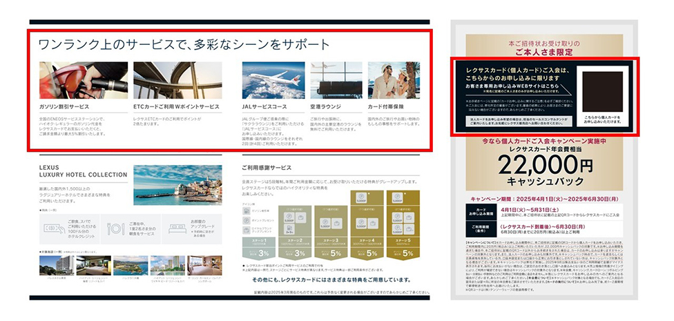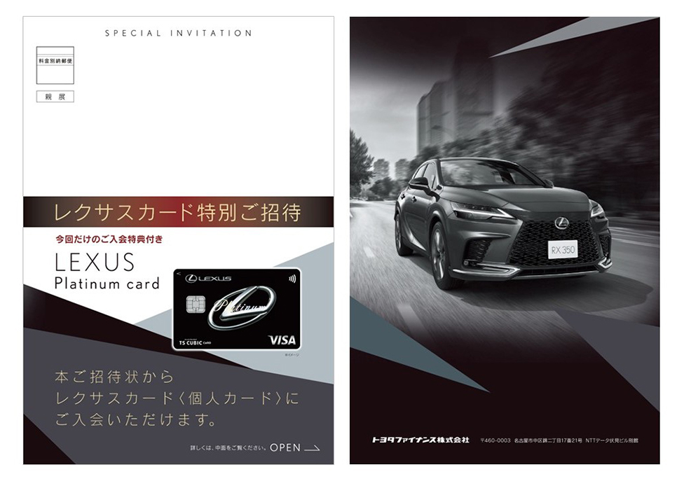 岡本様:レクサスカードをまだ持ってない方に対して、入会を訴求するためのDMを制作しました。レクサスカードはレクサスのオーナー様しか入会することができないプラチナカードです。そのため、レクサスの販売店で車の商談する際に、カードへの入会もあわせて提案しているのですが、コロナ禍が明けた頃からレクサスの売り上げが急増したことに伴い、販売店スタッフの手が回らない状況になってきています。それをフォローするため、レクサスのオーナー様向けにDMを発送しました。